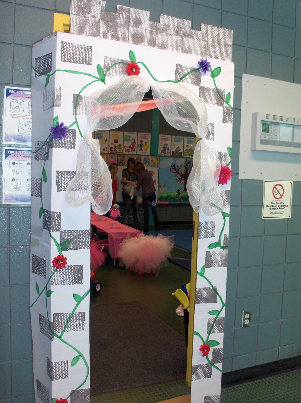 For the entrace, I cut out a castle door from a twin mattress box I got from a local furniture store. I painted it light grey, then used a sponge with darker grey to make a brick affect. Then I painted vines and hot glued flowers to it. I found some white sparkly fabric at the dollar store(ofcourse) and I bunched it up using clear hair elastics and hot glued that around the draw bridge door I cut out! It was easy and super cute!